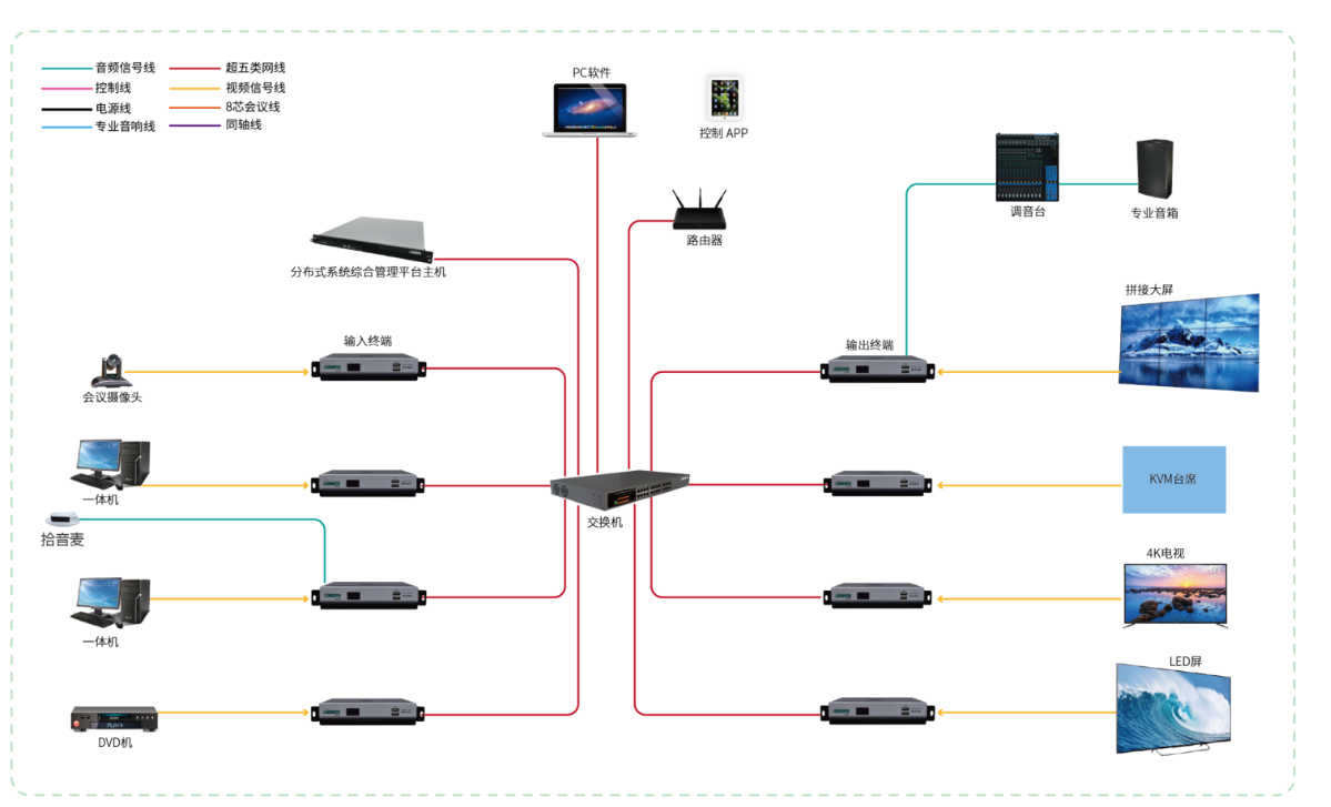 4K可视化分布式综合管理平台指两个或两个以上人指挥厅或会议、分机构组成,实现指挥中心实时调度,音视频交互采集、数据交控。并具有音视频传输控制技术图形信号切换技术、多屏图像处理技术、网络处理技术、智能控制技术和可视化操作管理等融合为一体,实现了各区域间信号高清采集、视觉无损、高清还原、环境控制互联互通等功能,通过触控方式即可实时控制和调度不同区域的信号源。满足了用户对智慧型综合管理平台的“安全、稳定、可扩展、互联互通、可视化便捷操作”的复合型需求,提高了指挥调度的决策效率、资源发布和故障预防的及时性以及会议沟通的高效性。 4K可视化分布式综合管理平台以行业客户需求为背景,将先进稳定的音视频传输控制技术、图形信号切换技术、多屏图像处理技术、网络技术和智能控制技术等融合为一体,满足了用户对智慧型综合管理平台的“安全、稳定、可扩展、互明互通、可视化便捷操作”的复合型需求,提高了指挥调度的决策效率、资源发布和故障预防的及时性以及会议沟通的高效性。系统采用分布式架构部署,当其中的某个产品突发故障时,系统仍能正常运行。采用全新的视频编解码技术和无损传输方式,为客户带来了极致的音视频体验效果和可视化操作,实现了各区域间信号高清采集、无压缩传输、高清还原、环境控制、互联互通等功能,用户只需通过触控设备即可实时控制和调度不同区域的信号源,广泛应用于会议、监控、多媒体信息发布和指挥调度等多种场所。